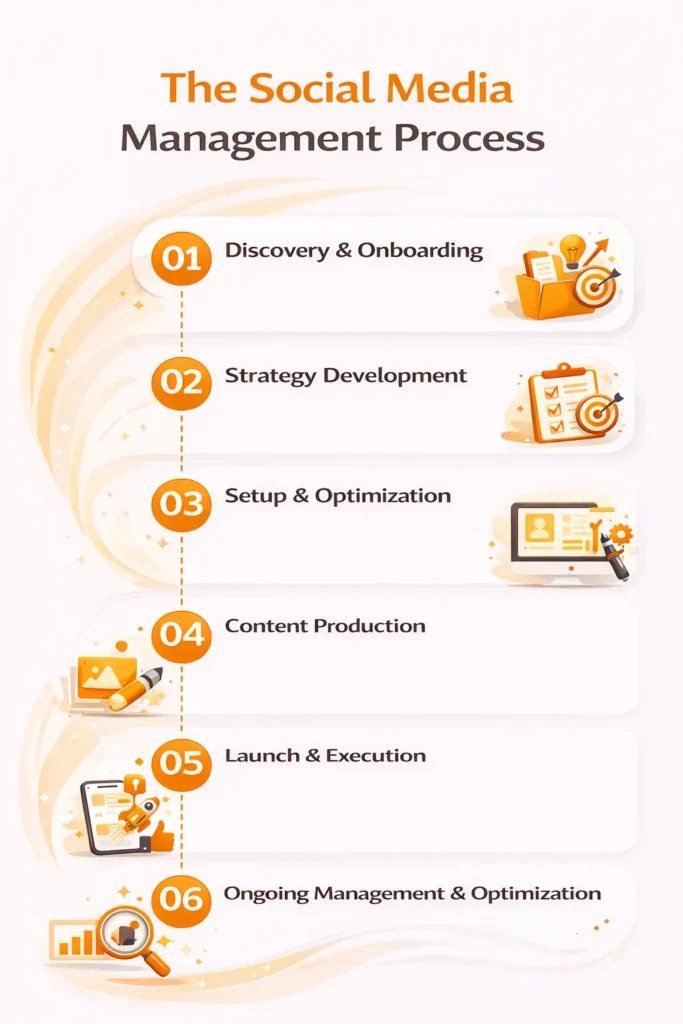Successful social media management requires a structured, strategic approach. Our proven six-phase process ensures seamless onboarding, strategic planning, and continuous optimization by providing you with clarity, consistency, and measurable outcomes from day one.
